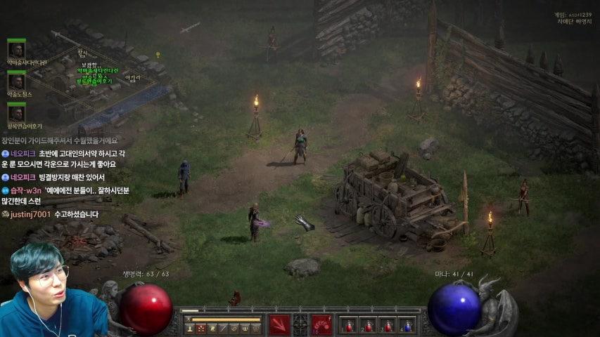 횃불따는 방법= 메피스트의 선고오라는 20이다. 하지만 나의선고오라는 25이다. 선고오라는 높은쪽의 스킬만 발동함으로 저항이 깍이지 않는다. 메피를 잡을때는 선고오라를 이용하고 나머지는 마소 망명세팅으로 스마이트 광신을 사용한다. 아이템세팅은 굳이 바꿀이유가없다.. 몹이 많거나 거슬릴때는 천상의 주먹을 사용한다.